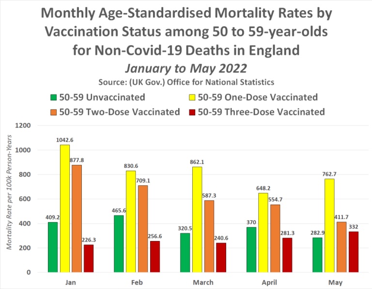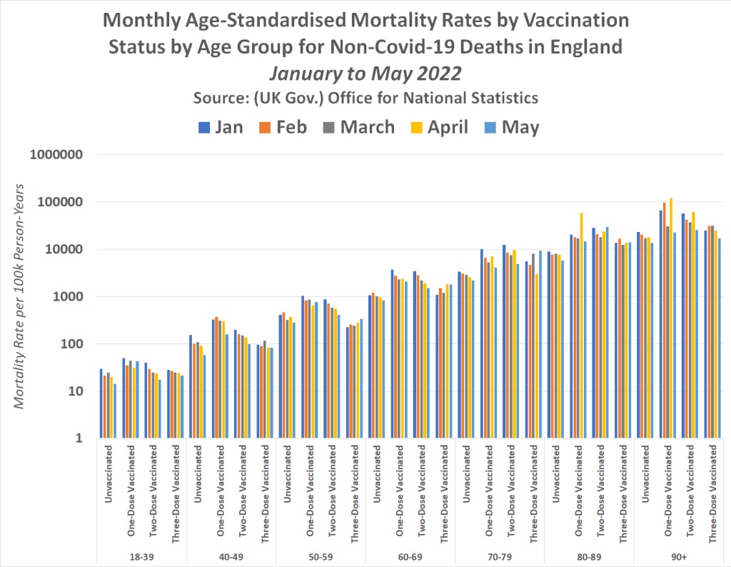 Graficele următoare prezintă ratele lunare de mortalitate standardizate pe vârstă în funcție de statutul de vaccinare în rândul fiecărei grupe de vârstă pentru decesele non-covid în Anglia între ianuarie și mai 2022, folosind cifrele conținute în tabelul 2 din setul de date recent publicat și compilat de agenția guvernamentală britanică, Office for National Statistics (Oficiului Național de Statistică):