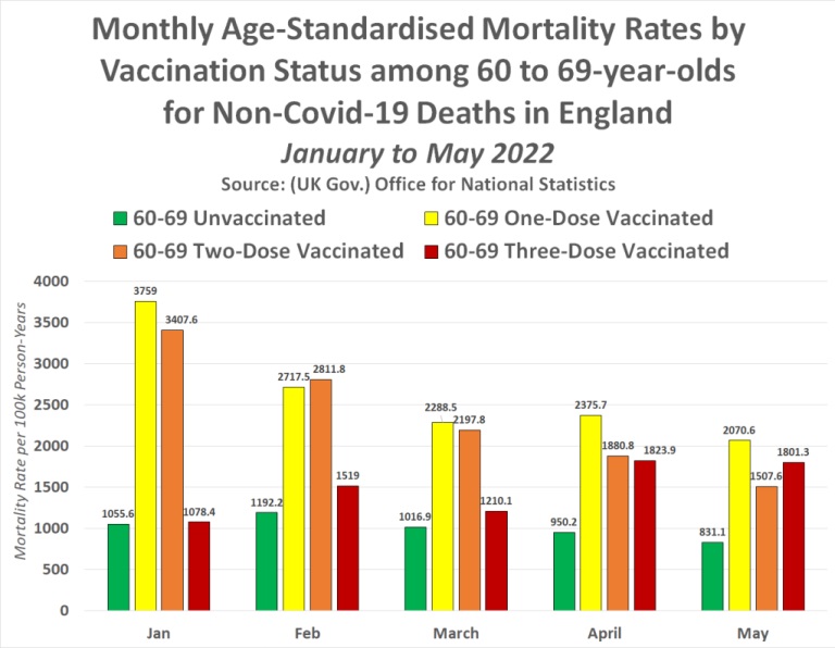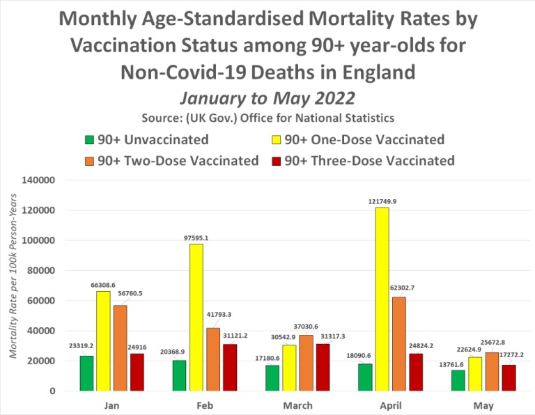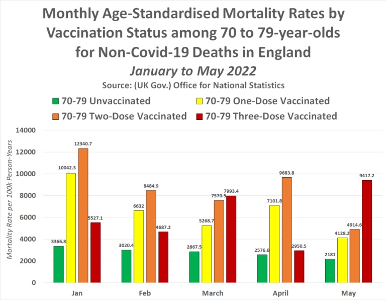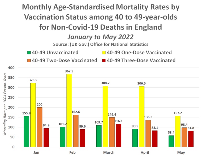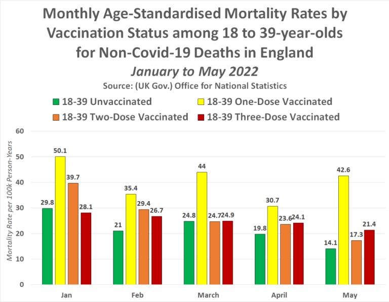În fiecare lună, de la începutul anului 2022, tinerii de 18-39 de ani parțial vaccinați și dublu vaccinați au avut un risc mult mai mare de a muri decât tinerii de 18-39 de ani nevaccinați. Cu toate acestea, persoanele de 18 până la 39 de ani vaccinate triplu au avut o rată de mortalitate care a crescut în fiecare lună după campania de rapel în masă care a avut loc în Marea Britanie în decembrie 2021.