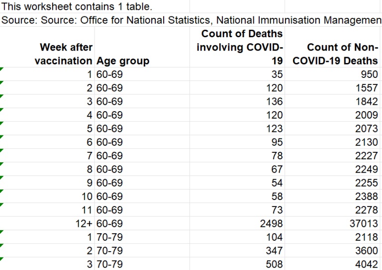 Tabelul 9 din setul de date conține cifre privind „Numărătoarea pe întreaga perioadă a tuturor deceselor înregistrate, grupate în funcție de numărul de săptămâni de la vaccinare în care au survenit decesele; pentru decesele care implică covid și decesele care nu implică covid, decese survenite între 1 ianuarie 2021 și 31 mai 2022, Anglia”.