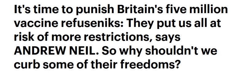 Dacă derulați înapoi până în decembrie 2021, poate vă amintiți un titlu infam publicat de Andrew Neil în Daily Mail, care suna astfel: „Este timpul să pedepsim cele cinci milioane de oameni care refuză vaccinurile în Marea Britanie: Ei ne pun pe toți în pericol să suportăm mai multe restricții. Prin urmare, de ce să nu le anulăm din libertăți?”.