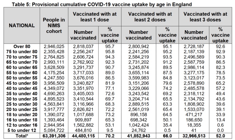 Următorul tabel este preluat de la pagina 65 din raportul săptămânii 27 și arată acceptarea vaccinului în Anglia în funcție de vârstă: