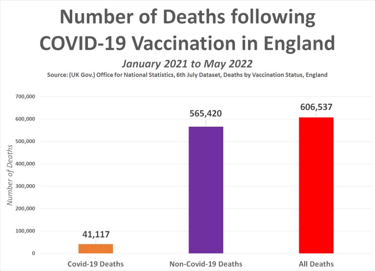 Potrivit Oficiului Național de Statistică, între 1 ianuarie 2021 și 31 mai 2022, un total de 41.117 persoane au murit cu covid după vaccinare și un total de 565.420 de persoane au murit din orice altă cauză după ce au acceptat injecția. Acest fapt înseamnă că, în total, 606.537 de persoane au murit din păcate până la 31 mai 2022 în urma vaccinării anti-covid.