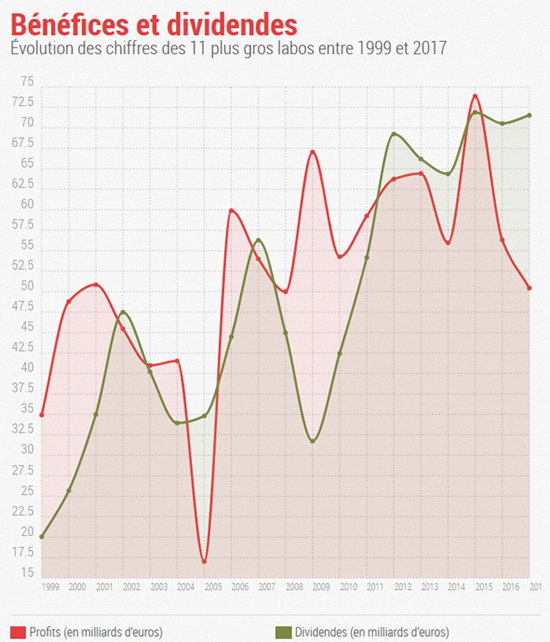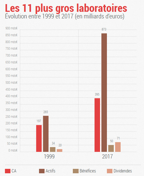 Entre 1999 et 2017, le chiffre d’affaires de ces onze laboratoires a été multiplié par deux, pour atteindre la somme record de 395 milliards d’euros en 2017 ! Parallèlement, la valeur de leurs actifs – tout ce que l’entreprise possède, de la valeur d’un brevet au patrimoine immobilier, en passant par ses placements financiers – a été multipliée par 3,3 pour atteindre 873 milliards d’euros (un chiffre toutefois en repli par rapport au record de 2016 : 988 milliards). Les dividendes et rachats d’actions – autrement dit la part des profits directement redistribués aux actionnaires – ont été multipliés par 3,6 pour atteindre 71,5 milliards d’euros en 2017 – alors que les bénéfices nets n’ont augmenté « que » de 44 % sur la même période.