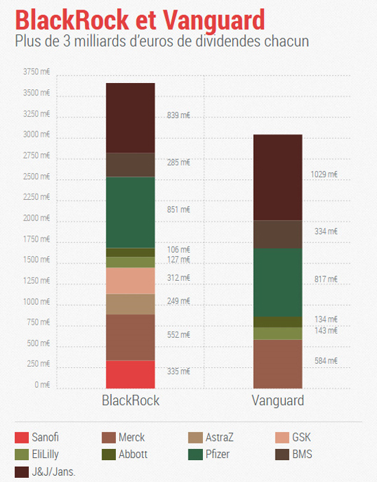 [4] Vanguard possède ainsi 7,2 % de Merck, 7,5 % de Bristol Myers Squibb, 7,7 % d’Abbott, 7,3 % de Pfizer, 6,5 % d’Eli Lilly, 7,6 % de Johnson & Johnson. Soit 3,04 milliards de dividendes en 2017. State Street, Capital Group et Wellington Management ne suivent pas loin derrière.