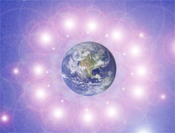 – După cum puteţi să observaţi, calitatea acestor energii tainice (care au, fiecare, o anumită frecvenţă de vibraţie) este inferioară şi tocmai din această cauză frecvenţa lor preponderentă de vibraţie este joasă. Priviţi, vă rog, cu multă atenţie acest nor gri al egoismului ce predomină din nefericire în jurul planetei Pământ! După cum puteţi observa, sclipirile albastre ce vi se înfăţişează întocmai ca nişte străfulgerări reprezintă anumite aspiraţii spirituale suficient de puternice, dar, după cum puteţi să constataţi, ele sunt cel mai adesea acoperite, sau altfel spus înăbuşite, de curenţii subtili coloraţi ai patimilor inferioare, cum ar fi ura, răutatea, orgoliul şi aviditatea, care au format această aură gigantică ce predomină actualmente în jurul Pământului. După cum puteţi să vă daţi seama, toate acestea au apărut în decursul miilor de ani. Este tocmai de aceea necesară o transformare colectivă majoră, care va face cu putinţă atât elevarea frecvenţei predominante de vibraţie a planetei Pământ, cât şi o transformare corespunzătoare (în bine) a culorii curenţilor energetici care predomină deocamdată la nivelul planetei noastre. Abia atunci planeta Pământ va putea să devină cu adevărat, şi apoi să rămână, o planetă albastră. Prin urmare, este important să vă daţi seama că este urgent necesar ca această planetă, ce este supranumită, deloc întâmplător, „planeta albastră“, trebuie să devină şi în sfera aurei ei tainice tot albastră sau, de ce nu, chiar alb-strălucitoare!