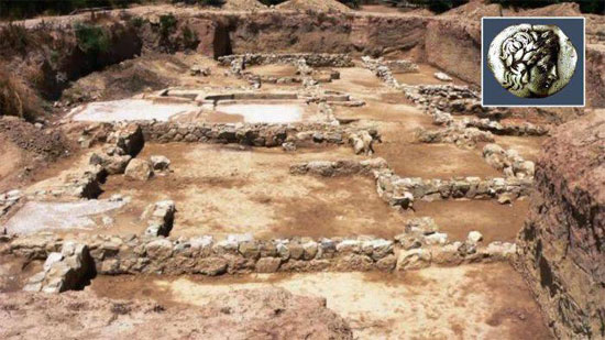 Ruine de la Helike și o monedă (foto medalion) descoperită în zonă