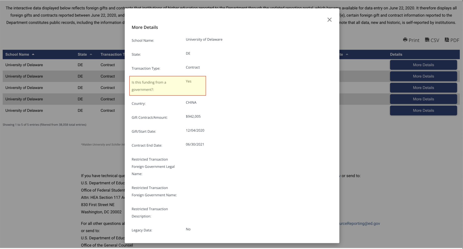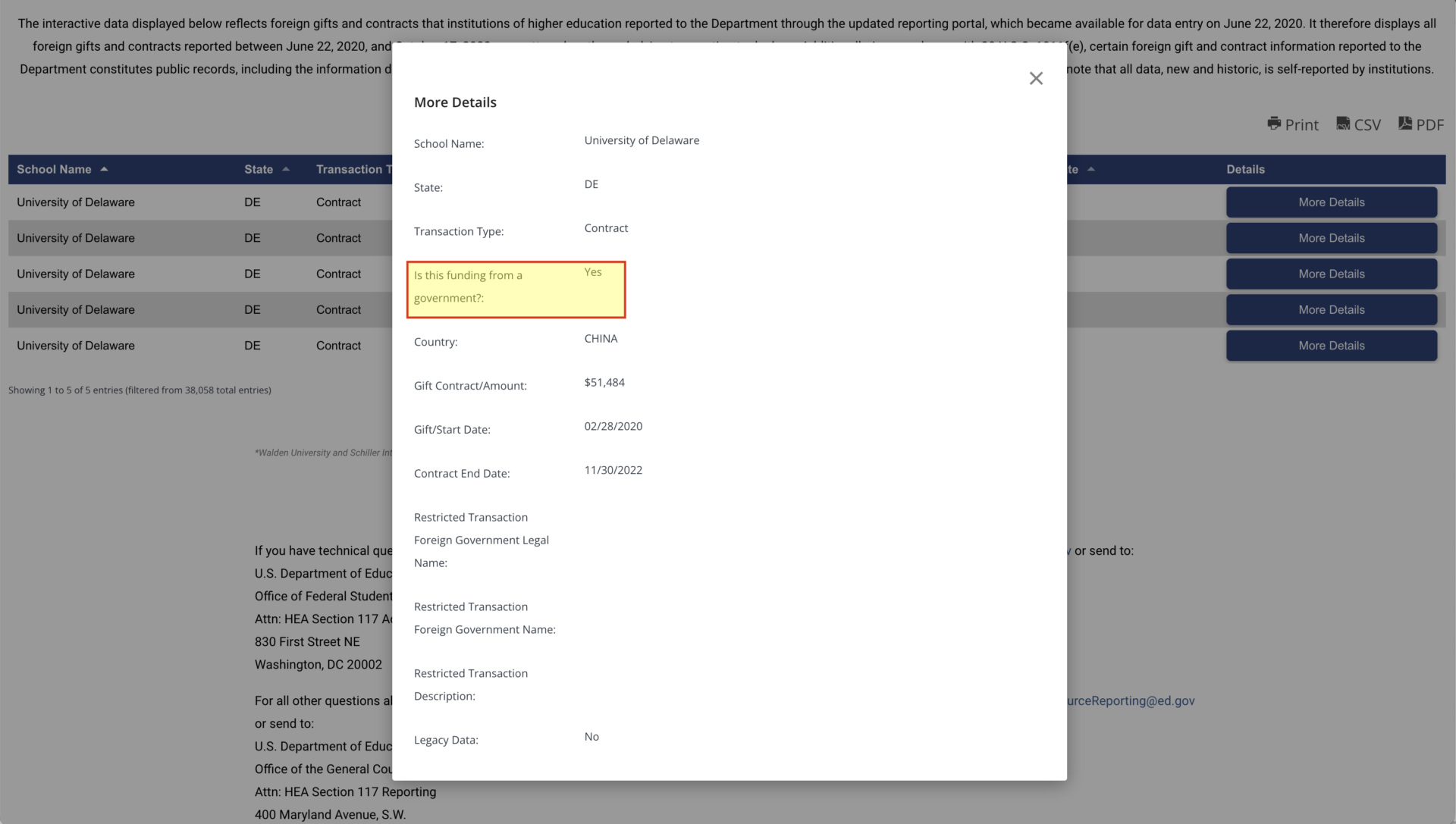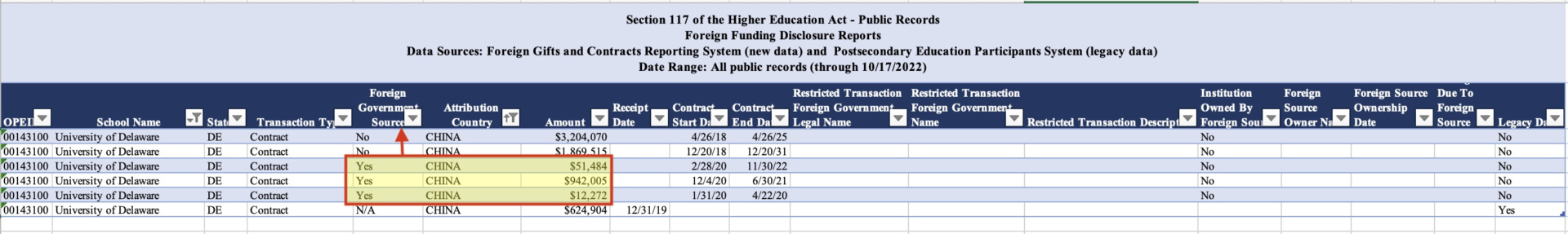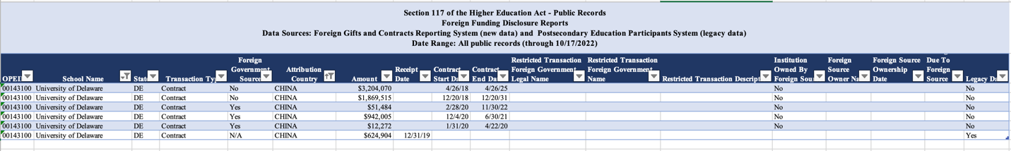 Trei dintre aceste donații din China – cu un total combinat de 1.005.761 de dolari – au fost raportate ca provenind dintr-o „sursă guvernamentală străină”, conform înregistrărilor Departamentului de Educație al Statelor Unite (DOE), adunate din informațiile raportate către DOE de către Universitatea din Delaware.