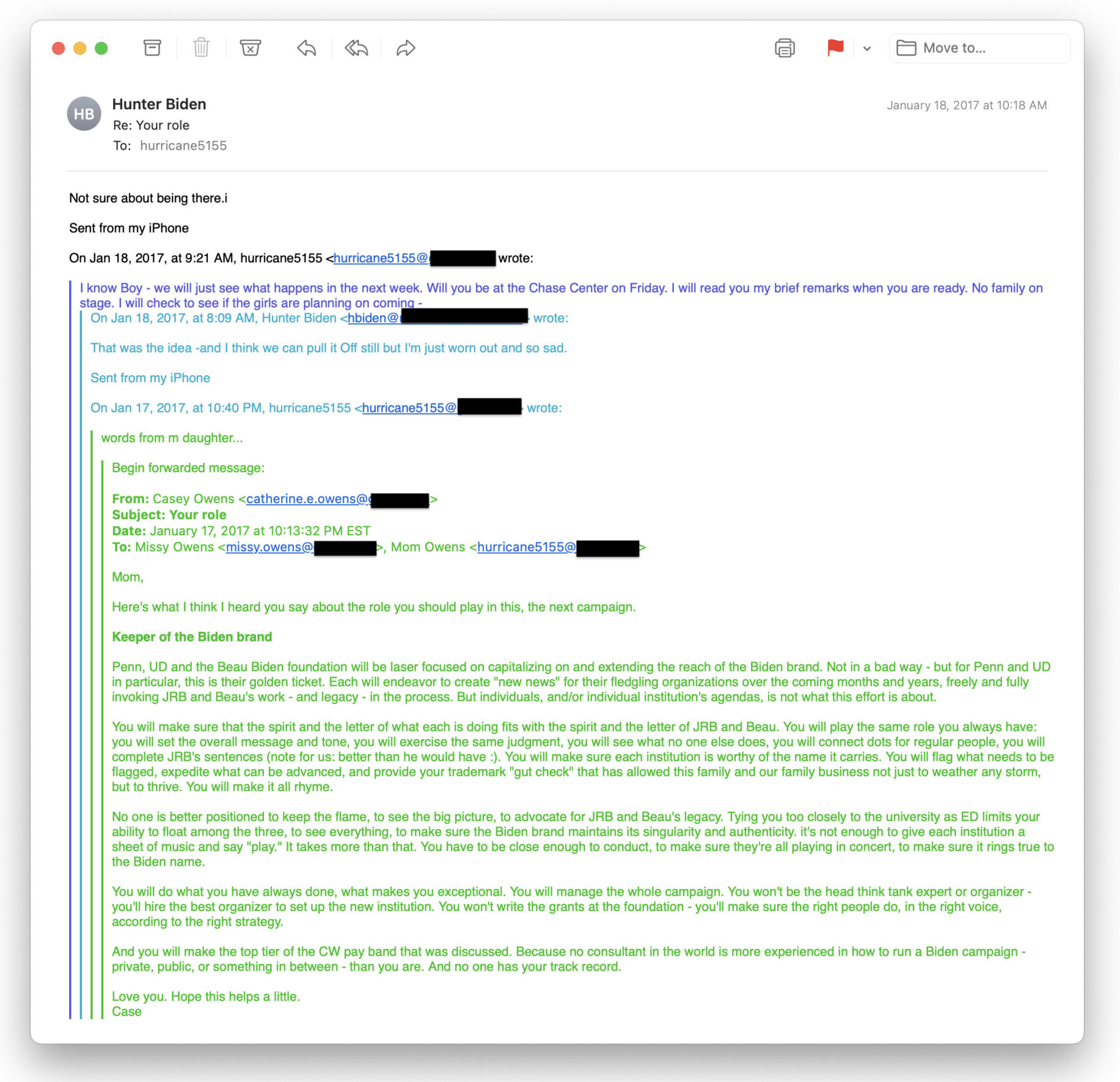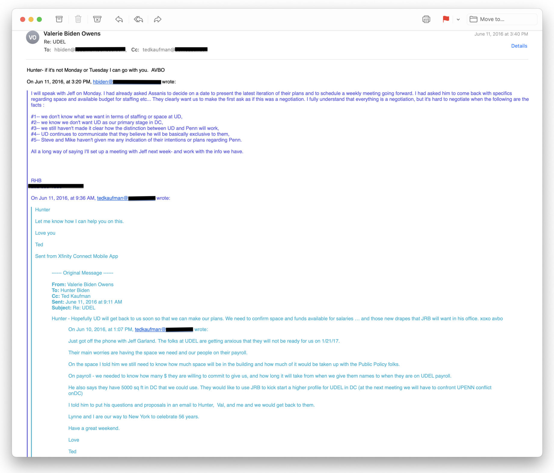 În martie 2016, Hunter Biden s-a întâlnit cu noul președinte al UD, dr. Dennis Assanis, în timp ce Hunter și asociații săi de afaceri făceau planuri pentru a crea o „scenă” pentru a promova „marca Biden”, arată e-mailurile din laptopul abandonat de Hunter. Alte e-mailuri de pe laptop indică faptul că Hunter și asociații săi de afaceri erau preocupați de creșterea „potențialului de câștiguri viitoare” al lui Joe, în timp ce Joe era încă vicepreședinte.