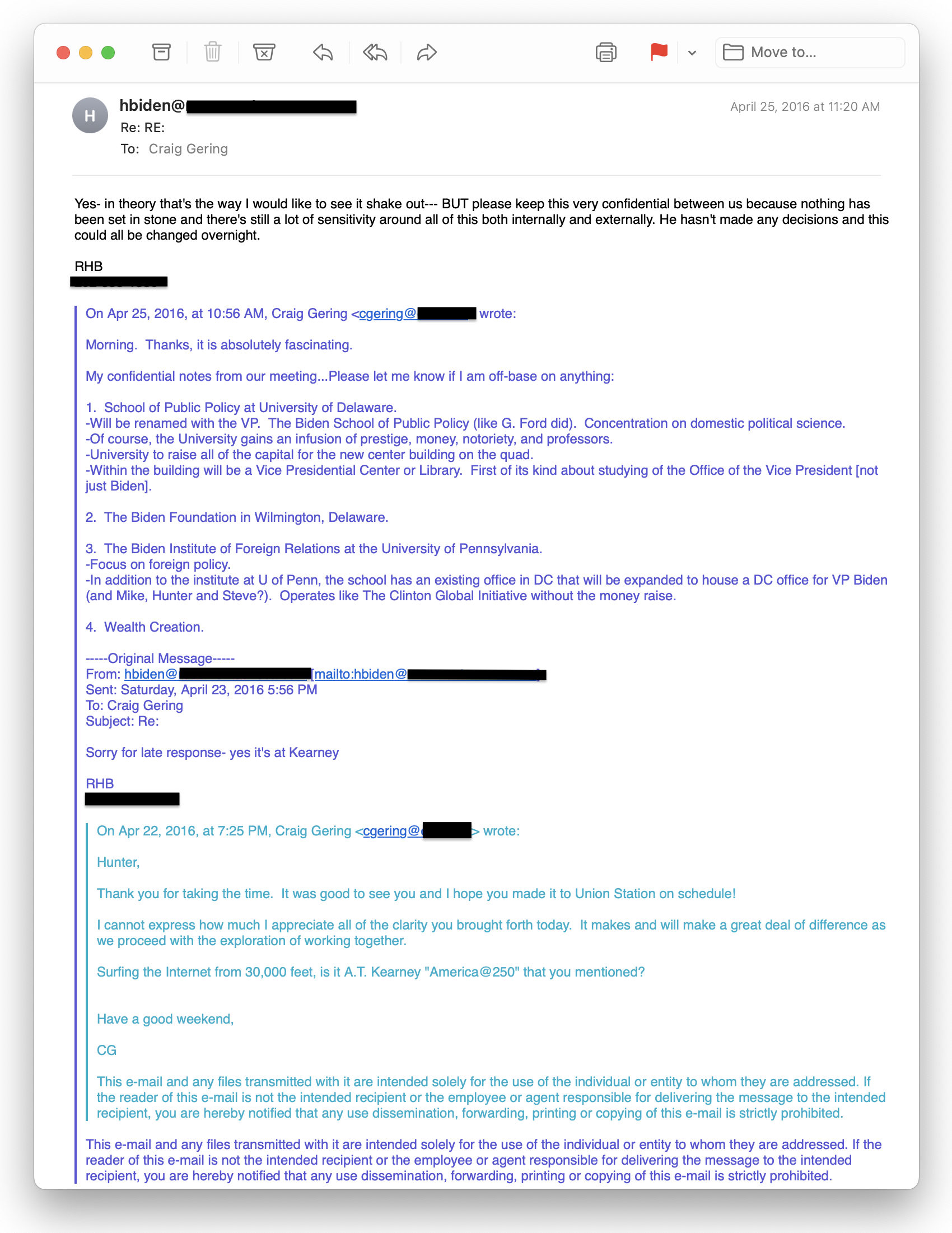 La o lună după ce s-a întâlnit cu viitorul președinte al UD, Hunter a discutat cu un agent de talente pe nume Craig Gering despre planurile Institutului Biden de la UD și ale Centrului Biden de la UPenn, după cum arată corespondența sa de pe laptop. „Notele confidențiale” ale lui Gering dezvăluie planurile lui Hunter Biden de a servi într-o anumită calitate la Penn Biden Center, unde s-a descoperit recent că documente clasificate erau stocate ilegal.