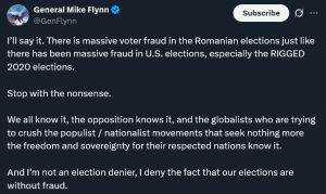 Și nu sunt un «contestatar al alegerilor», ci contest ideea că alegerile noastre sunt lipsite de fraudă”, a scris pe X generalul american Mike Flynn.