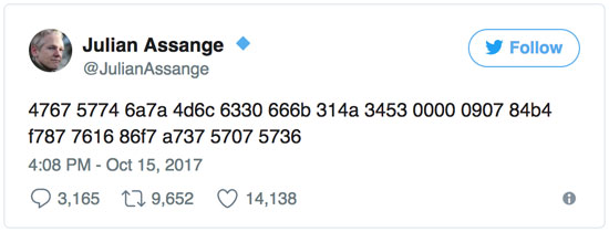 Si Assange a réussi à le faire lui-même comme je m’y attendais, alors, comme je l’ai dit, Trump n’aura pas d’autre choix que de s’attaquer à la descente de DEUX des trois agences à 3 lettres / ministères dont j’ai parlé la semaine dernière… FBI et CIA… On voit alors un tweet d’Assange où il a lâché un code de déverrouillage, appelé hash, suggérant qu’une nouvelle fuite majeure est très imminente.