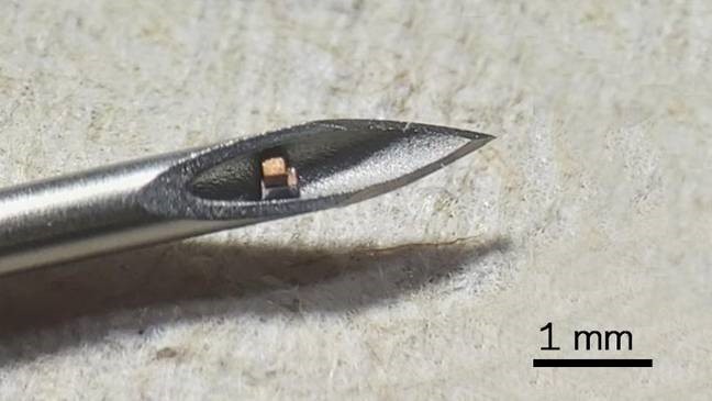 Volumul total al cipului este mai mic de 0,1 mm3, având aproximativ aceeași dimensiune cu cea a unui acarian de praf, fiind vizibil doar printr-un microscop. Cercetătorii, al căror studiu a fost publicat pe 7 mai, au folosit energia ultrasunetelor pentru a comunica fără fir cu dispozitivul.