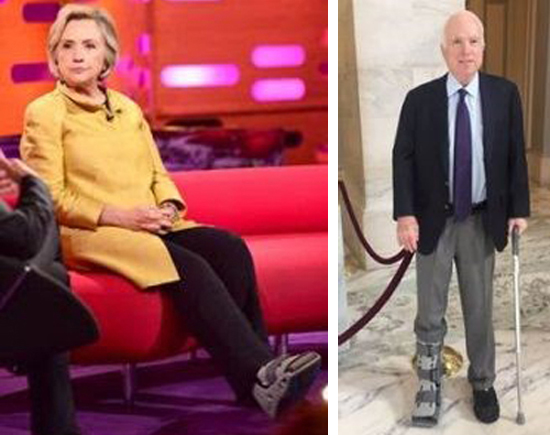 Surse din Pentagon au trimis fotografiile de mai jos, arătând că Hillary Clinton și senatorul american John „Daesh” McCain „sunt în custodie, purtând cizme ortopedice pentru a ascunde brățara GPS de la glezna piciorului drept”.