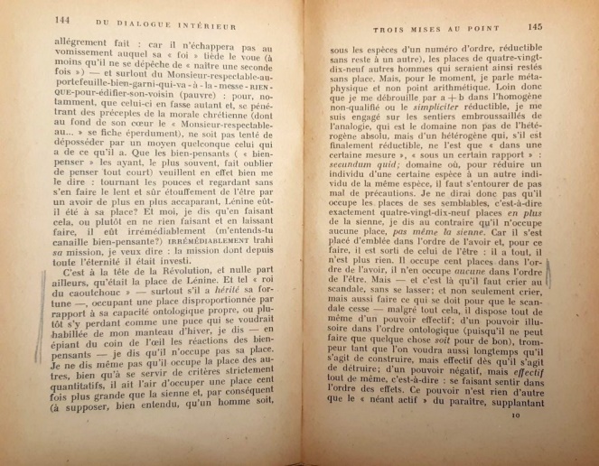Dar iată ce aspirații avea tânărul Șora: „Oricine va răsfoi volumul Du dialogue intérieur va vedea ce elogii îi aduce Șora lui Lenin, antidotul «ființei» și al «acțiunii» la averea burgheziei, replica adevăratului crez la credința căldicică a burghezului. Aceeași opoziție între credința patetică a desueților pupători de moaște și patosul revoluționar al salvatorilor și al făuritorilor unei lumi noi. Puteți vedea cum lăuda Șora, înainte de a reveni la București pentru a se angaja în Ministerul de Externe condus de Ana Pauker, locul pe care Lenin îl ocupa de drept în fruntea revoluției (C’est à la tête de la Révolution, et nulle part ailleurs qu’était la place de Lénine, p. 144)”.