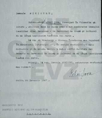 Surpriza, pentru naivi, desigur, este totală. În cele câteva file se află CV-ul lui Mihai Șora, o recomandare oferită de Mihai Neculce, consilier la Serviciul de Presă și Cultură al Legației Române de la Paris și……. cererea de angajare a lui Mihai Șora în slujba comuniștilor de la București, datând din 28 ianuarie 1947.