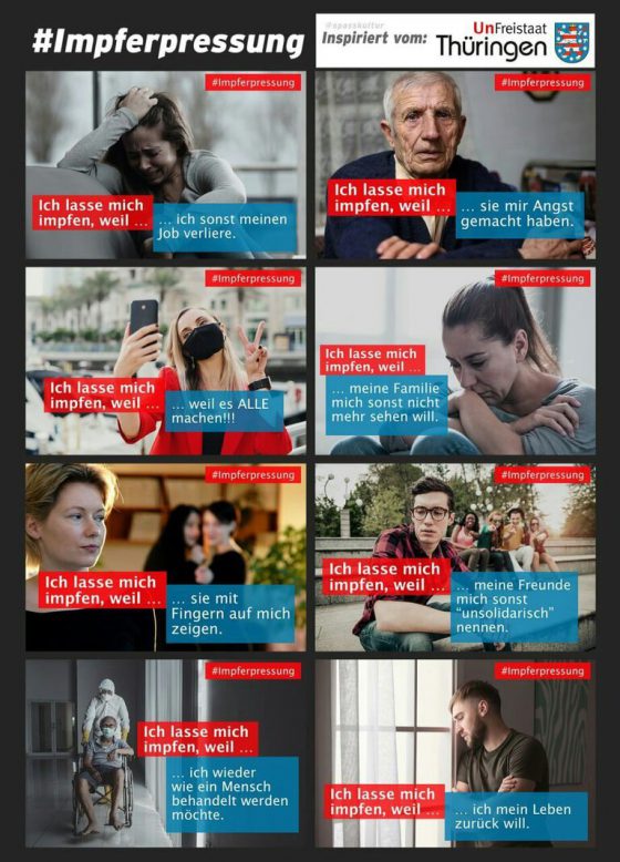 Cineva, probabil un fotograf profesionist de meserie, care nu pare impresionat în sens favorabil de campania oficială de propagandă vaccinistă, a postat și el pe Twitter o contra-campanie sub hashtag-ul „Impferpressung” (Șantaj cu vaccinul).