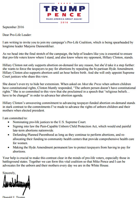 Iată („parafate” de grupul de lobby pro-viață Susan B. Anthony List) câteva dintre promisiunile pe care dl Trump le-a făcut grupurilor conservatoare americane, și care i-au adus votul a 81% dintre creștinii evanghelici: