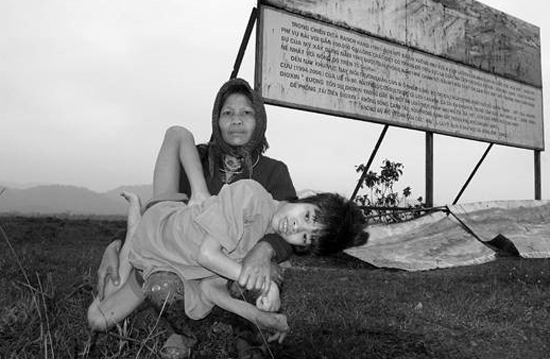 8. Kan Lay, o mamă în vârstă de 55 de ani, își ține în brațe fiul având 14 ani născut cu dizabilități severe din cauza Agentului Oranj.