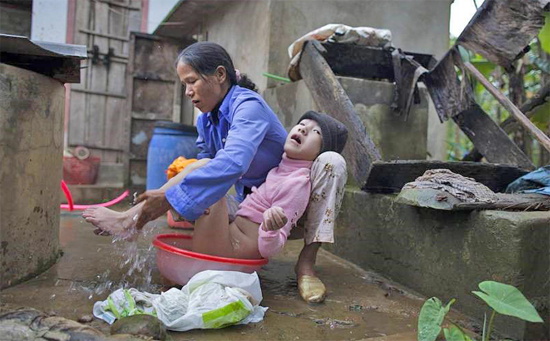 9. Tran Thi Nghien își îmbăiază fiica cu handicap, o victimă a Agentului Oranj incapabilă să-și poarte singură de grijă.