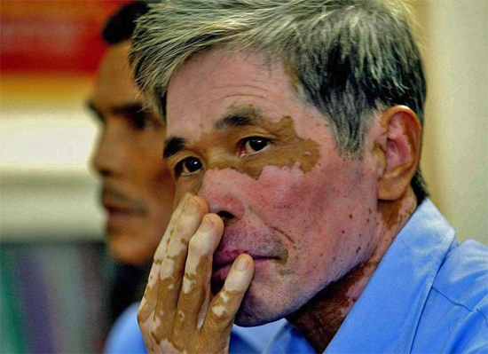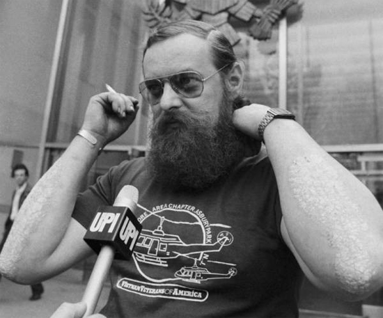 12. Veteran american arătându-și eczemele întinse de pe mâini cauzate de lucrul cu Agentul Oranj. Sub haine, eczemele acoperă jumătate din suprafața trupului.