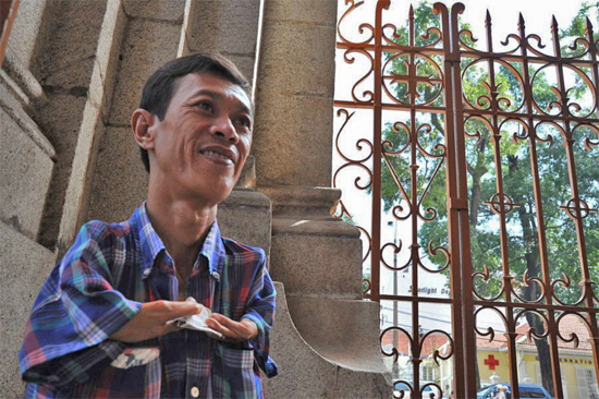 15. Bărbat cerșind bani lângă o catedrală. S-a născut cu mâinile deformate din cauza Agentului Oranj, fiindu-i imposibil să-și găsească ceva de lucru.