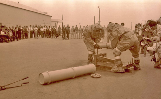 22. Personal militar demonstrând cum trebuie tratate scurgerile de Agent Oranj, aparent mult mai conștienți de pericolul chimicalelor pe care le folosiseră până atunci.