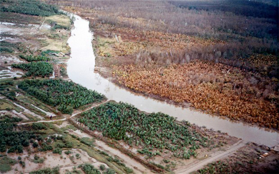3. O fotografie din aer expunând efectele Agentului Oranj. Terenul din stânga este nestropit, cel din dreapta este stropit.