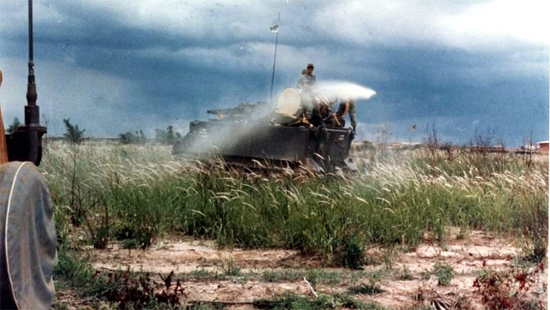 4. Nu toate chimicalele au fost stropite din aer. Acești soldați împrăștie erbicidele de pe un vehicul, luând contact de aproape și în mod direct cu periculoasele chimicale.