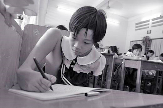 5. Un băiat de zece ani, născut fără mâini, scrie în caietul de clasă.