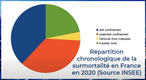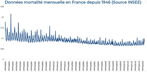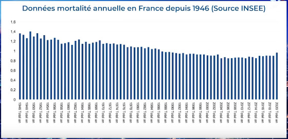 A H-C: Suntem la începutul lui 2021 [interviul a avut loc în luna februarie, n.n.], așa că putem să facem un bilanț. Am adunat datele pe care am reușit să le recuperăm de la Institutul Național de Statistică (INSEE), care dispăruseră pentru perioada de după 1946, deci vă fac un cadou de început de an acum. Am publicat aceste date ce arată mortalitatea din 1946 până azi. Există mai multe reprezentări, una anuală ce permite observarea mortalității în exces din 2020 prin comparație cu anii precedenți, mergând până în 1964. Veți vedea că a existat o mică mortalitate în exces fără a arăta cauza. Dacă aș privi ca istoric, nu mi s-ar părea justificat niciunul dintre traumatismele colective pe care le-am impus societăților noastre, niciunul dintre sacrificiile la care am fost forțați.