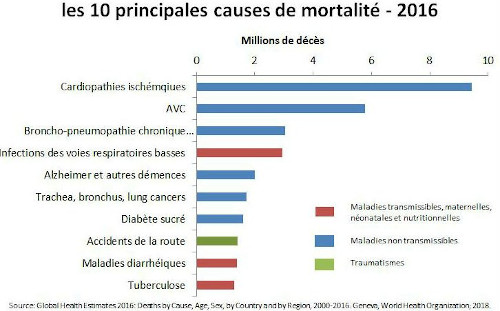 * După cum se poate observa pe site-ul OMS, lista celor 10 boli umane cele mai mortale include doar 3 boli transmisibile (infecțioase). Printre celelalte 7, găsim boli cardiovasculare la numărul 1 (aproape 10 milioane de decese în 2016), accidente vasculare cerebrale la numărul 2 (aproape 6 milioane de decese în 2016), patologii pulmonare cronice la numărul 3, cum ar fi boala pulmonară obstructivă cronică (BPOC).