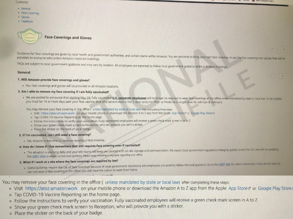 Fotografiile a ceea ce pare a fi un comunicat al companiei Amazon, furnizate către National File, relevă că „începând cu 24 mai, angajații corporației americane complet vaccinați nu vor mai fi obligați să poarte măști la birou”, însă angajații Amazon vor fi obligați să dovedească statusul de vaccinare și să poarte tot timpul asupra lor o insignă specială care să dovedească aceasta.
