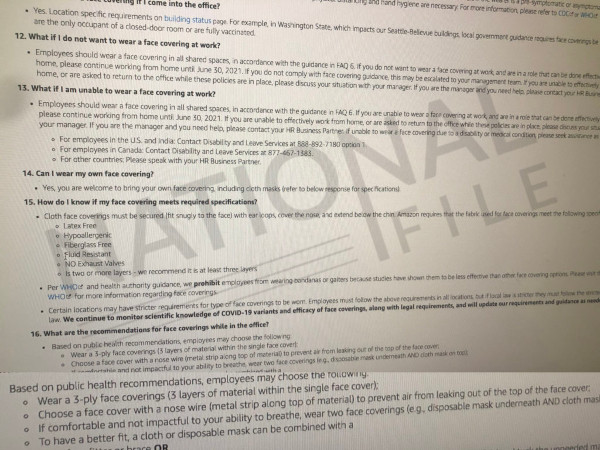 Angajații Amazon care „aleg să nu se vaccineze” sunt informați că „orientările actuale ale CDC și ale administrației locale impun să poarte o mască de protecție în timp ce se află la birou”. Angajații Amazon care „nu doresc” sau „nu pot purta o acoperitoare a feței” sunt instruiți să „continue să lucreze de acasă”. În cazul în care angajații nu pot lucra de acasă și „nu respectă îndrumările privind purtarea măștii”, atunci cazul lor „poate fi înaintat echipei de conducere”.