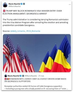 „Administrația Trump ia în considerare să refuze admiterea României în Programul Visa Waiver după anularea alegerilor și arestarea candidatului la președinție Georgescu”, a scris pe X jurnalistul Mario Nawfal, prețuit de Elon Musk, , în data de 21 martie 2025 ‒ foto captură mai sus.