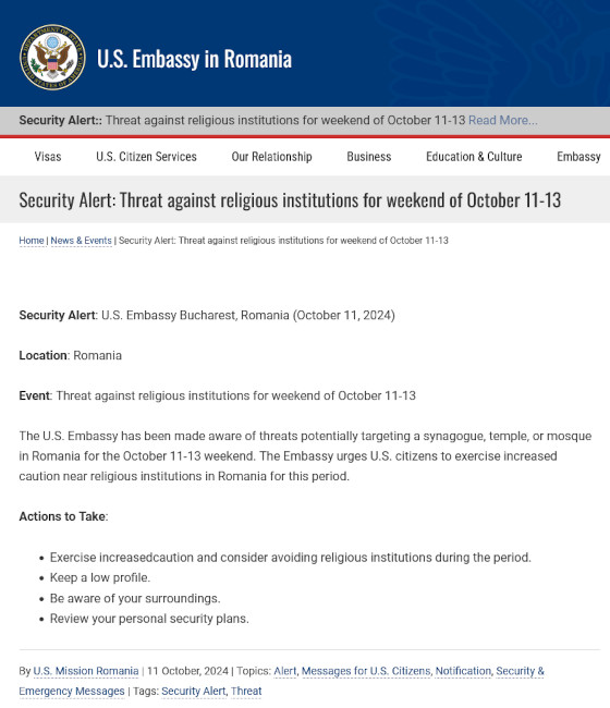 „Alertă de securitate: Ambasada SUA București, România (11 octombrie 2024) Locație: România Eveniment: Amenințare împotriva instituțiilor religioase pentru weekend-ul 11-13 octombrie. Ambasada SUA a fost informată cu privire la amenințări care ar putea viza o sinagogă, templu sau moschee din România pentru weekend-ul 11-13 octombrie. Ambasada îndeamnă cetățenii americani să manifeste prudență sporită în apropierea instituțiilor religioase din România în această perioadă. Acțiuni de întreprins: manifestați prudență sporită și luați în considerare evitarea instituțiilor religioase în această perioadă. Păstrați un profil scăzut. Fiți conștienți de împrejurimi. Revedeți-vă planurile personale de securitate.”