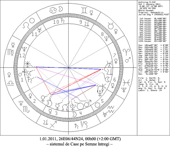 Astrograma întocmită pentru 01.01.2011, 00h00, 26E06/44N24 (+2h00GMT) ne aminteşte despre ceea ce a spus Andre Malraux: “Secolul XXI va fi religios sau nu va fi deloc”. Calitatea Casei a IX-a, a spiritualităţii şi a străinătăţii, precum şi a guvernatorului ei, Mercur, atrag atenţia că omenirea se află la o răscruce religioasă şi spirituală fără precedent, care va genera mişcări sociale foarte puternice sau care poate afecta întreaga planetă. În acest context, când rasa umană în ansamblul ei are de luat decizii capitale legate de relaţia ei directă cu Dumnezeu, chestiunile pe care acum le considerăm esenţiale pentru viaţa noastră pot deveni într-o singură clipă banale (precum cariera, banii, posesiunile materiale, norocul în dragoste, funcţiile social-politice).