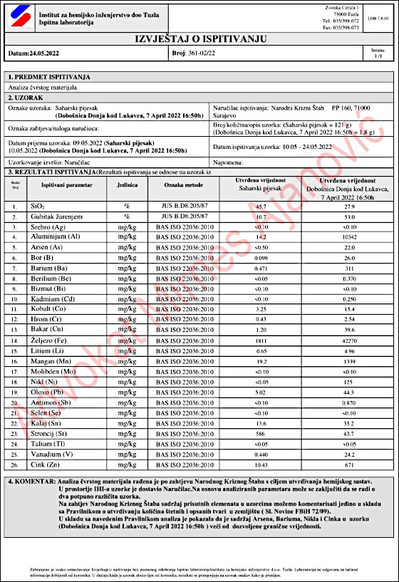 Vă reamintim că Personalul Național de Criză din BiH a înaintat Laboratorului de Teste al Institutului de Inginerie Chimică Tuzla un eșantion de nisip din sudul Tunisiei și un eșantion de nisip din Dobošnica Donja lângă Lukavac, prelevat pe 7 aprilie 2022, după «ploaia murdară», pentru a efectua o analiză comparativă a nisipului saharian real cu nisipul rezultat în urma ploii, a declarat avocatul Mirnes Ajanović, președintele Partidului BOSS-Bosniac.