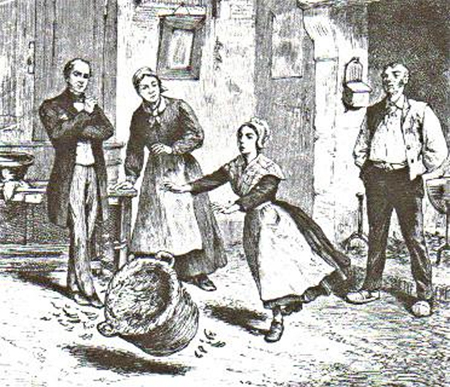 Le 15 janvier, le temps était lourd, le ciel était sombre et il résonnait des grondements sourds du tonnerre. Dans la petite chaumière de sa tante, Angélique Cottin, sa cousine Julie et deux jeunes voisines tissaient des gants de filet de soie à la lueur des chandelles quand soudain, à vingt heures, le guéridon en chêne brut, qui servait à fixer l’extrémité de la trame, sembla prendre vie, remuant et se déplaçant sans que leurs efforts réunis ne parviennent à le maintenir dans sa position ordinaire. Effrayées de voir une chose si étrange, les quatre jeunes filles sortirent de la maison en criant, attirant certains de leurs voisins qui, ne croyant pas un mot de leur histoire, leur conseillèrent de retourner travailler. Deux des jeunes brodeuses finirent par s’y résoudre, puis une troisième les suivit et voyant qu’il ne se passait rien, Angélique imita ses compagnes mais à peine avait-elle repris sa trame que le guéridon s’agita de nouveau. Pendant un moment il dansa d’une curieuse manière, semblant entrainer Angélique à sa suite, puis brusquement il se renversa et se projeta violemment contre un mur. Pensant sa nièce, ou le meuble, en proie à quelque sortilège, Mme Loisnard proposa alors à ses ouvrières d’arrêter là leurs ouvrages, et elles allèrent se coucher.