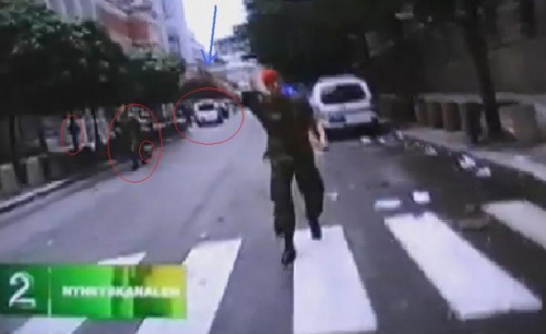 Police closed the island after the massacre was over and Breivik was arrested. Pictures of the massacre or of the hour just before the massacre at Utøya are not available, although there were more than 500 young people with mobiles on the island. No wonder, since the police confiscated all mobile phones. NRK was, however, in place with his helicopter over the island during the massacre, as opposed to the police and military. Helicopter photos appear to show a parked car, dark, between the tents of Norwegian People’s Aid. They also show a white car behind the dark one and a car in the woods right by. One or two of these cars are not accounted for.