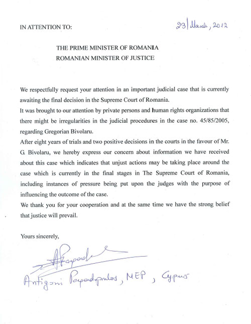 Scrisoarea europarlamentarului cipriot Antigoni Papadopoulou adresată primului ministru al României şi ministrului justiţiei din România – 23 martie 2012