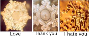 Ceva mai târziu, Masaru Emoto a observat că prin congelarea apei distilate se obțin cristale hexagonale. Dacă apa a fost blestemată / înjurată / certată, cristalele se sparg, în timp ce la congelarea agheasmei se obțin frumoase forme cristaline, structurate în modele complexe.