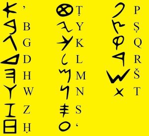 Alfabetul era însă o invenţie anterioară descoperirii tăblițelor din Ugarit. Se pare că cea mai veche mărturie cunoscută o constituie inscripţiile de la Serabit el-Khadim din Peninsula Sinai, care datează de la mijlocul veacului al XV-lea î.H. Ele au fost gravate în minele de peruzea din care lucrătorii semiţi extrăgeau pietrele semiprețioase pentru faraon. Dacă unele dintre semne au rămas necunoscute, majoritatea au fost interpretate; cercetătorii au observat că un grup format din cinci litere cu sensul „stăpână” revenea de mai multe ori; era vorba fără îndoială de zeiţa egipteană Hathor, protectoarea minelor de turcoaz. Secvenţa de cinci litere demonstrează că scrierea era alfabetică și servea notării unei limbi semite, înrudite cu feniciana. În mod evident nu muncitorii din mină au inventat alfabetul: ei au utilizat un sistem deja pus la punct. Având la bază această primă invenţie, scribii din Ugarit au realizat litere cu aspect diferit, adaptate scrierii forme, întâlnită în civilizaţia asiro-babiloniană. Distrugerea Ugaritului în secolul al XIII-lea î.H. în urma invaziei popoarelor mării a dus la dispariţia alfabetului care purta numele oraşului.