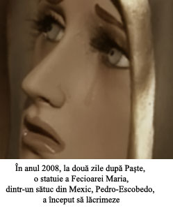 Exemplul cel mai recent îl constituie o modestă statuie a Sfintei Fecioare închisă într-o nişă vitrată într-un sătuc din Mexic, Pedro-Escobedo. Instalată acolo de vreo doi ani, această statuie înaltă de un metru a început să lăcrimeze la două zile după Paşte, în anul 2008. Doar CNN a difuzat un reportaj cu imagini ale lacrimilor formate în colţul ochiului şi rostogolindu-se pe obrajii Fecioarei. Dar reportajul nu a fost deloc reluat pe posturile europene, fără îndoială de teamă că oamenii ar putea să-şi regăsească credinţa sau să-şi pună întrebări. Totuşi, faptul că din senin apar lacrimi în ochii unei statui de marmură este ceva care ar trebui să şocheze gândirea noastră raţională şi tehnologică.