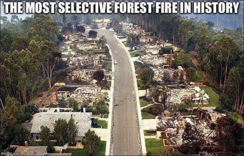 These “wildfires” left mailboxes, plants, front yards, back yards, eucalyptus trees and other highly flammable things untouched, while somehow neatly and perfectly targeted particular houses, neighborhoods and areas. Are these the most selective “wildfires” in American history?