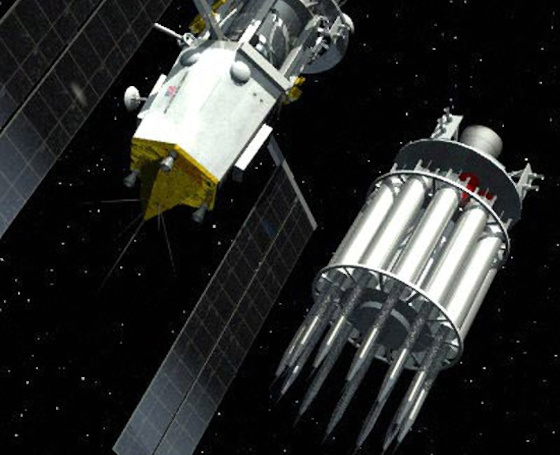 O altă tehnologie, ce este foarte departe, în mile și ani: o pereche de sateliți care orbitează la câteva sute de mile deasupra Pământului și care ar putea servi drept sistem de arme. Un satelit funcționează ca platformă de direcționare și comunicații, în timp ce celălalt poartă numeroase tije de tungsten pe care le poate proiecta asupra unor ținte în mai puțin de 15 minute. Când este instruit de la sol, satelitul vizat îi comandă partenerului să arunce una dintre săgețile sale. Tijele ghidate intră în atmosferă, protejate de o acoperire termică, călătorind cu 11 km pe secundă – comparabil cu viteza unui meteor. Rezultatul: devastarea completă a țintei, chiar dacă este îngropată adânc sub pământ. (Configurația cu două platforme permite ca arma să fie „reîncărcată” doar prin lansarea unui nou set de tije, mai degrabă decât prin înlocuirea întregului sistem).