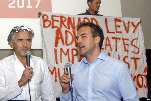 În timpul protestului, a fost afișat și un banner în engleză, în care scria: „Bernard-Henri Lévy susține crimele imperialiste”.