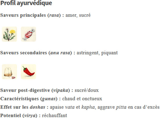 Parties utilisées : Cette monographie traite par défaut des racines qui sont principalement utilisées. Les feuilles, les fruits et les graines sont aussi employées en Ayurvéda.