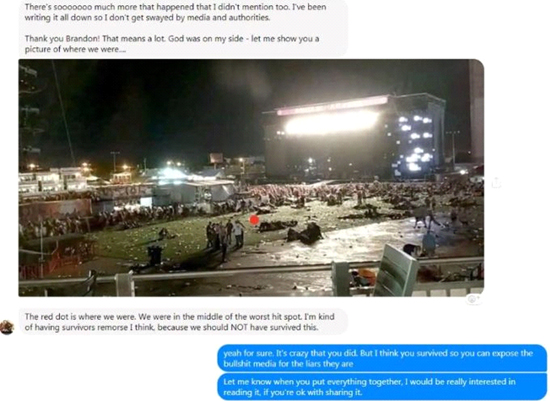 „Am văzut știrile de când am ajuns acasă la familia mea și nu are sens. Povestea spusă tuturor nu coincide cu mărturia noastră ca martori oculari. Este ceva greșit în ce spun ei, iar dovezile prezentate par false în opinia mea. Există mai mulți oameni care afirmă că a existat o doamnă spre începutul serii, care s-a urcat pe scenă să avertizeze oamenii că suntem cu toții gata să murim – ea și prietenul ei au fost escortați afară din incintă. De ce nu a fost menționată de autorități? Toți supraviețuitorii cu care am vorbit își amintesc, de asemenea, mai mulți trăgători – de ce nu suntem luați în serios? Multe lucruri nu au sens.”