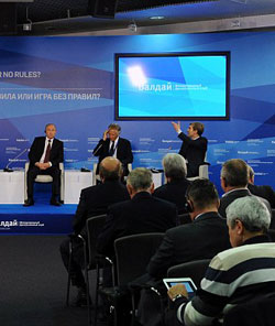 În discursul său anual la reuniunea din 27 octombrie 2016 a Clubului internațional de discuții Valdai, Vladimir Puțin a spus, între altele, cu referire la Statele Unite și principalii ei aliați: „Desigur, poate fi o misiune plăcută şi chiar profitabilă să te înfăţişezi ca apărător al civilizaţiei, împotriva noilor barbari. Singura problemă e că Rusia nu are nicio intenţie să atace pe cineva. Asta e chiar absurd. […] E de negândit, stupid şi complet nerealist. Numai Europa are 300 de milioane de oameni. Toate statele membre ale NATO, împreună cu SUA, au, probabil, o populaţie totală de 600 de milioane. Iar Rusia nu are decât 146 de milioane. E pur şi simplu absurd să concepi astfel de idei. Şi cu toate astea, ei le folosesc pentru a-şi urmări scopurile politice”.
