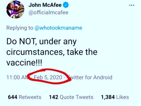 John McAfee avertiza pe Twitter încă din 5 februarie 2020: „Nu luați, sub nicio formă, vaccinul!